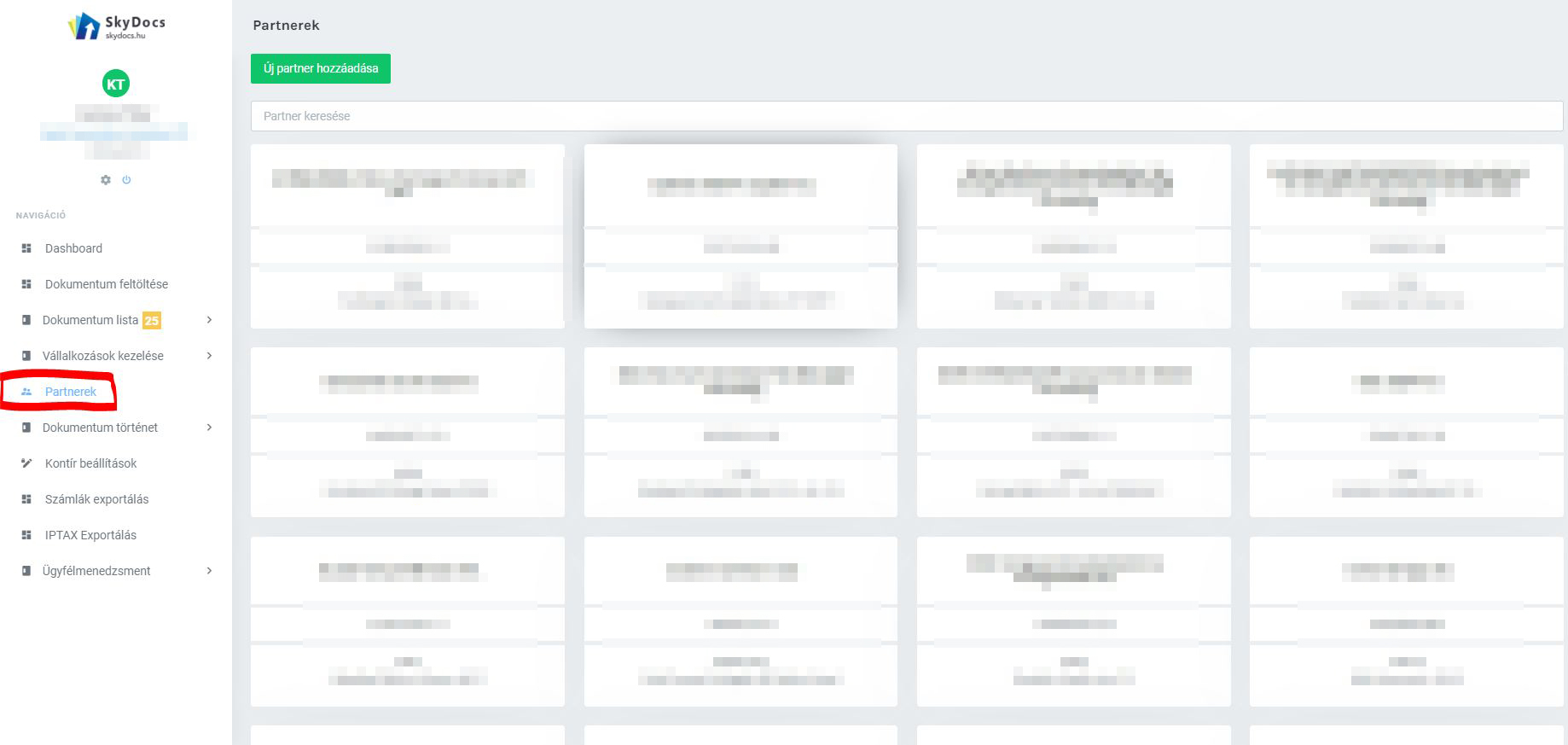 A partner adatok szerkesztését, illetve új Partner rögzítését, belépést követően a jobb oldali Navigációs menü Partnerek menü pontjában lehetséges elvégezni.